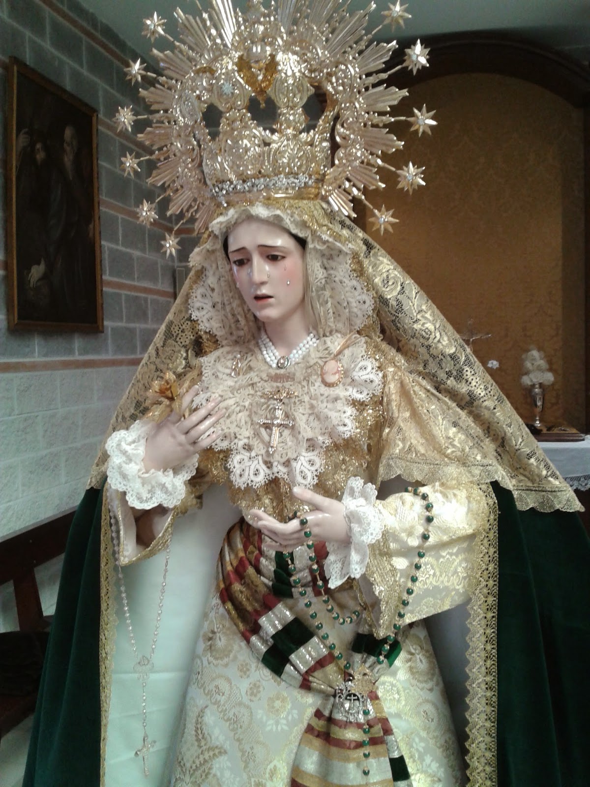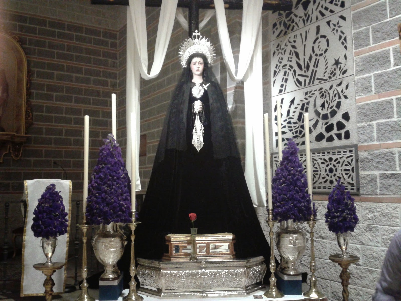 Este año 2014 se ha querido vestir la imagen de la Santísima Virgen de luto para el viernes santo, en las fotos que adjunto se muestra cómo se presentaba. Saya y manto negro, cubriendo su divinas sienes mantilla negra, sobre la que se situaba pequeña diadema plateada. Sobre su pecho corazón traspasado por daga, como representación de los dolores de la Virgen. Sus manos entrelazadas portaban pañuelo y rosario negro. Espero os guste cómo se presentaba la imagen.